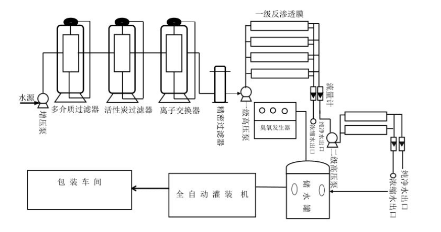 由我們的圖可以知道,我們的佛山純凈水設備的工藝流程是:原水→原水加壓泵→多介質過濾器→活性碳過濾器→離子交換器→精密過濾器→一級反滲透膜→全自動軟化水設備→保安過濾器→反滲透系統→純水箱。